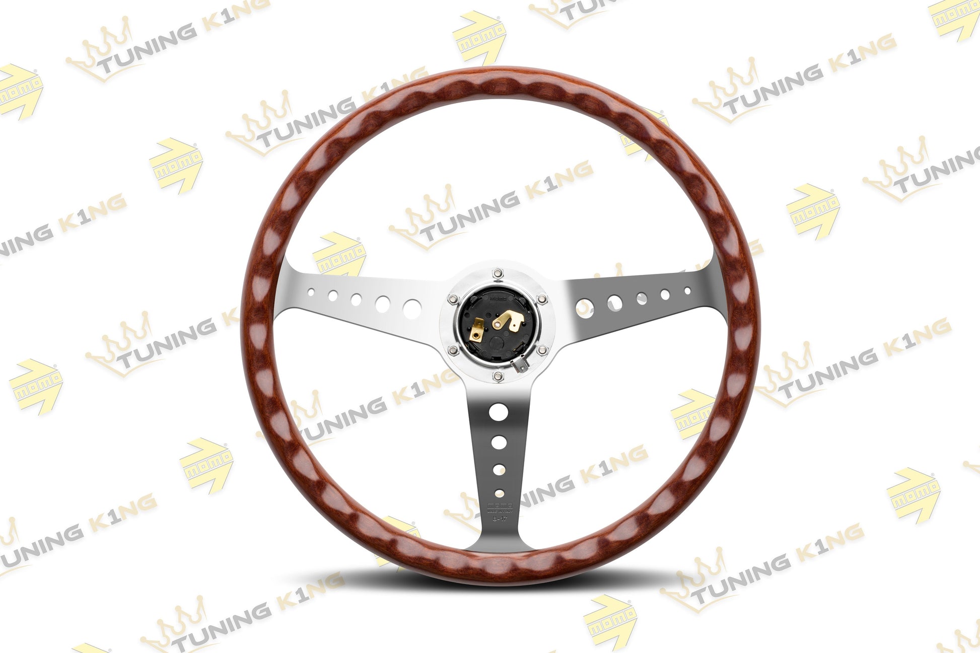 Das MOMO Holzlenkrad "California Wood" weist Elemente auf, die an die frühen Ferrari- und Porsche-Designs von MOMO erinnern. Außer dem typischen MOMO-Logo verfügt dieses Lenkrad über einen Griff aus Mahagoniholz mit hinteren Fingerrillen und den charakteristisch polierten Speichen.