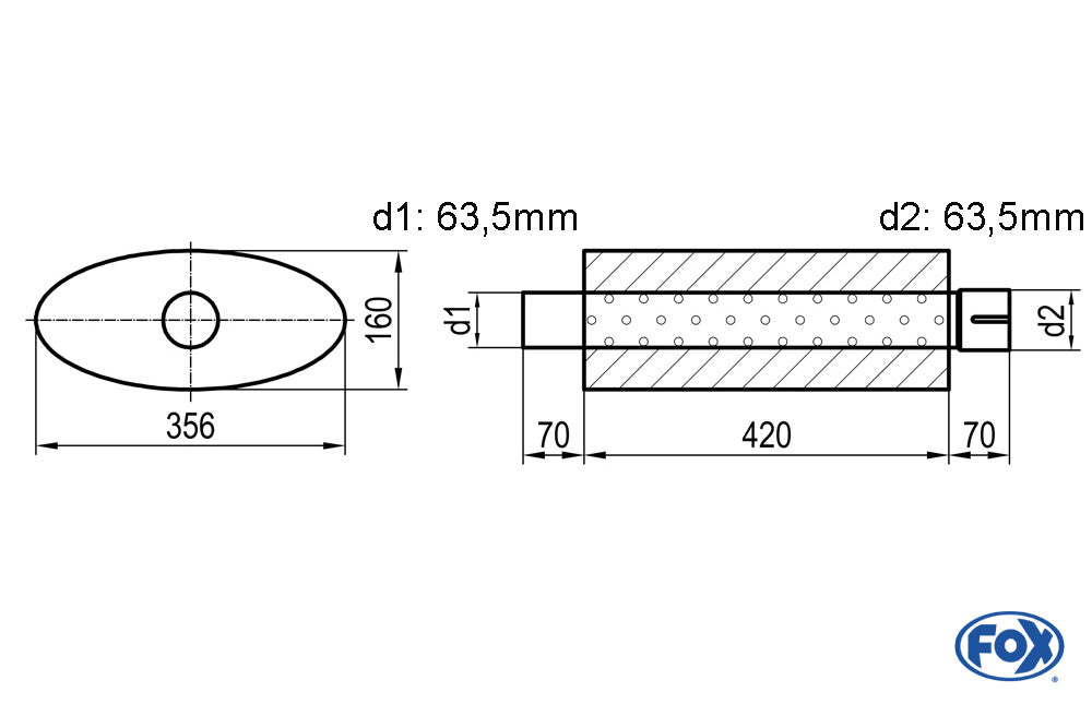 FOX Uni-Schalldämpfer oval mit Stutzen - Abwicklung 818 356x160mm, d1Ø 63,5mm d2Ø 64mm, Länge: 420mm