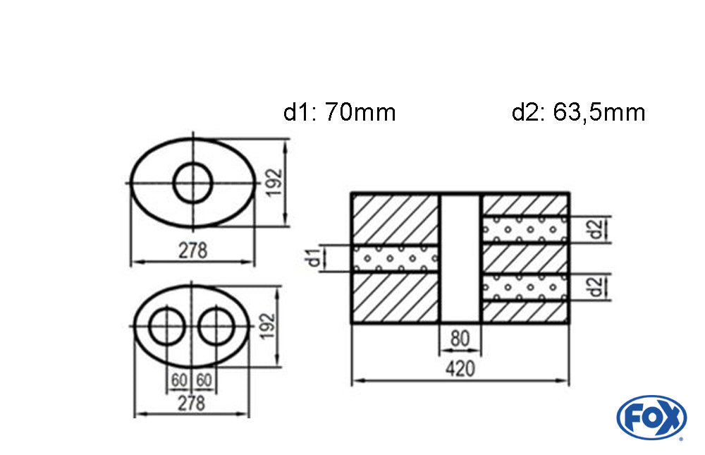 FOX Uni-Schalldämpfer oval zweiflutig mit Kammer - Abw. 754 278x192mm, d1Ø 70mm d2Ø 60mm, Länge: 420mm - Variante 2