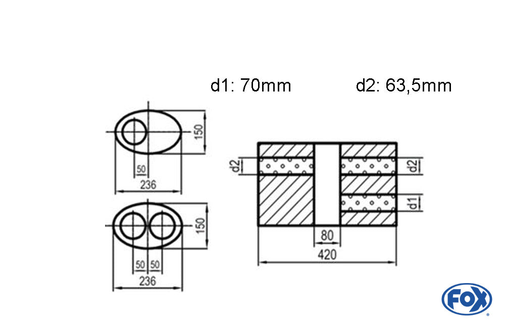 FOX Uni-Schalldämpfer oval zweiflutig mit Kammer -Abwicklung 618 236x150mm, d1Ø 70mm d2Ø 60mm, Länge: 420mm - Variante 1