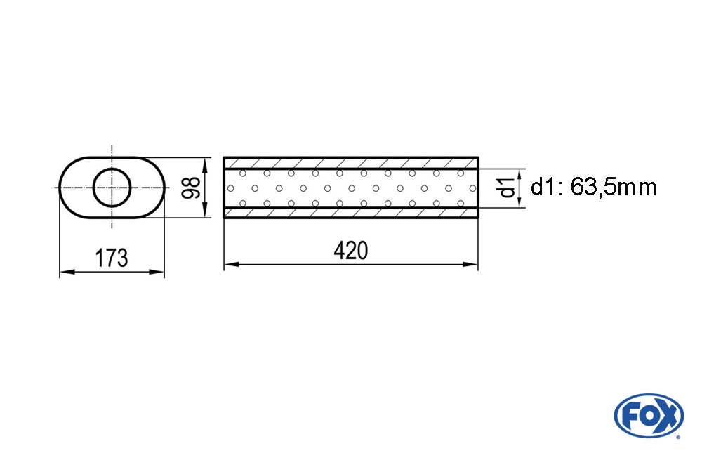 FOX Uni-Schalldämpfer oval ohne Stutzen - Abwicklung 450 173x98mm, d1Ø 63,5mm, Länge: 420mm