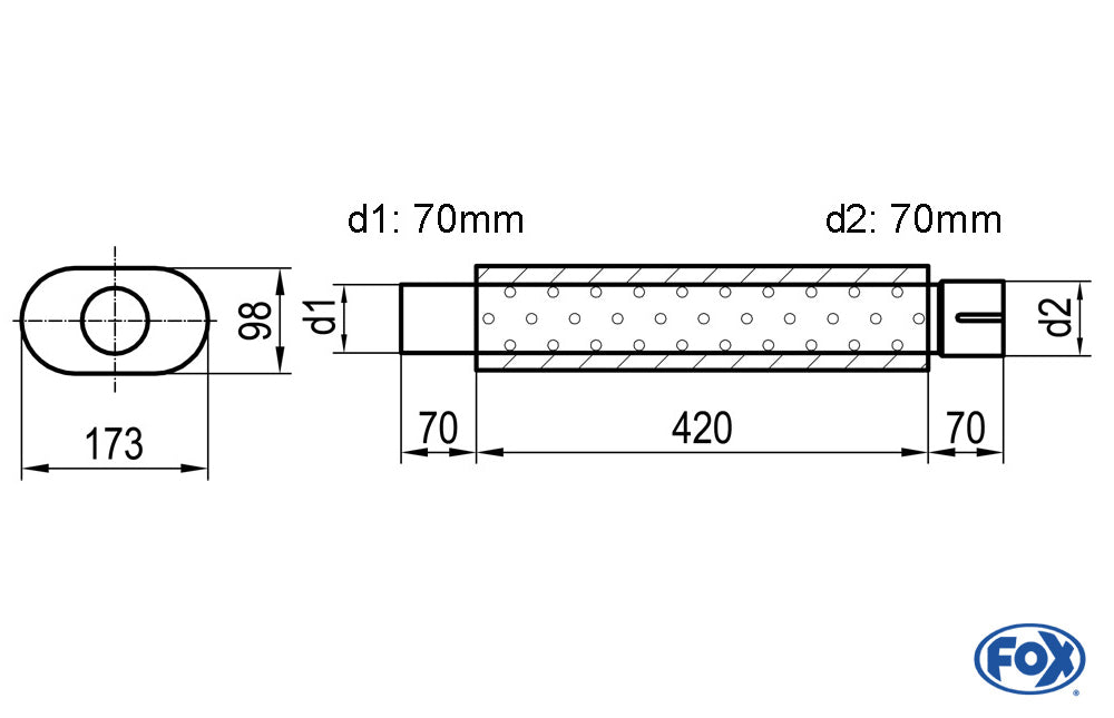 FOX Uni-Schalldämpfer oval mit Stutzen - Abwicklung 450 173x98mm, d1Ø 70mm d2Ø 70,5mm, Länge: 420mm