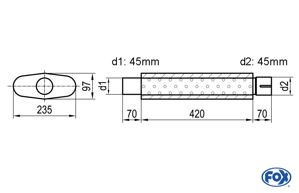FOX Uni-Schalldämpfer oval mit Stutzen - Abwicklung 558 235x97mm, d1Ø 45mm d2Ø 45,5mm, Länge: 420mm