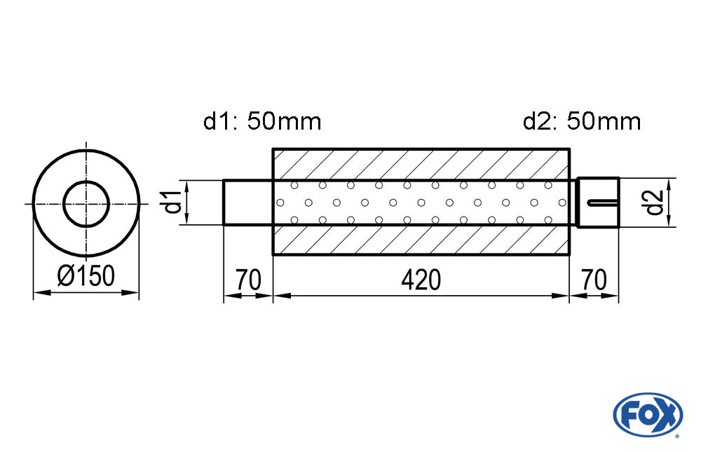 FOX Uni-Schalldämpfer rund mit Stutzen - Abwicklung 466 Ø 150mm, d1Ø 50mm außen - d2Ø 50,5mm innen - Länge: 420mm