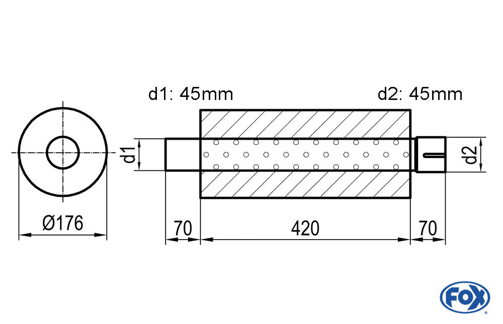 FOX Uni-Schalldämpfer rund mit Stutzen - Abwicklung 556 Ø 176mm, d1Ø 101,6mm außen, d2Ø 101,6mm innen - Länge: 420mm