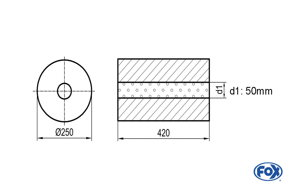 FOX Uni-Schalldämpfer rund ohne Stutzen - Abwicklung 784 Ø 250mm, d1: 50mm, Länge: 420mm