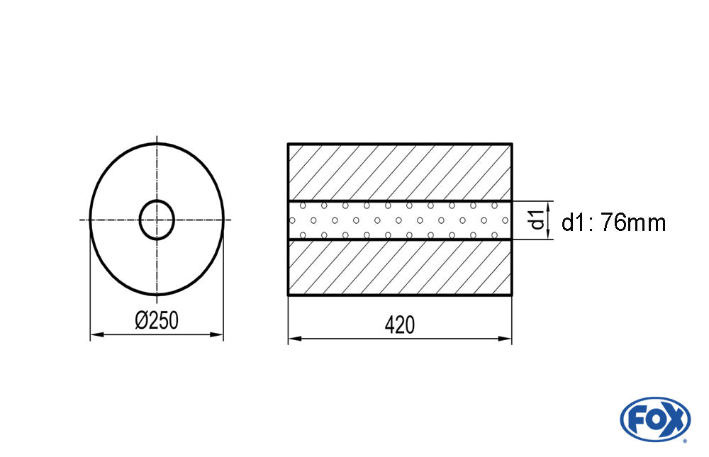 FOX Uni-Schalldämpfer rund ohne Stutzen - Abwicklung 784 Ø 250mm, d1: 76mm, Länge: 420mm