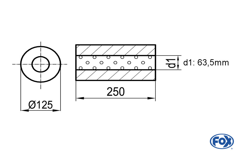 FOX Uni-Schalldämpfer rund ohne Stutzen - Abwicklung 390 Ø 125mm, d1Ø 63,5mm, Länge: 250mm