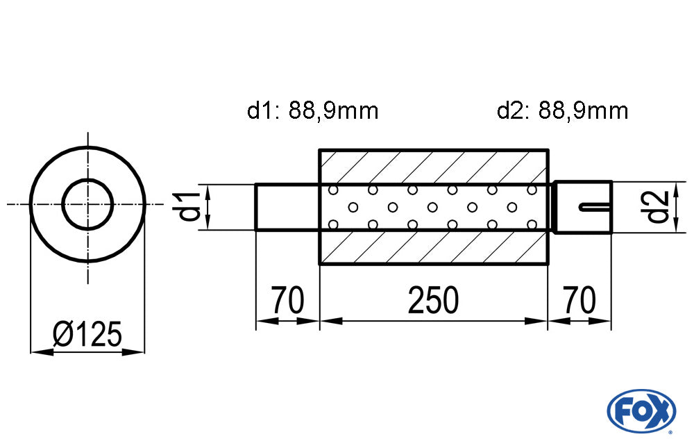 FOX Uni-Schalldämpfer rund mit Stutzen - Abwicklung 390 Ø 125mm, d1Ø 88,9mm außen - d2Ø 88,9mm innen - Länge: 250mm