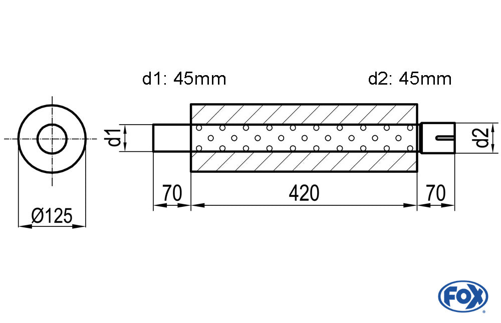 FOX Uni-Schalldämpfer rund mit Stutzen - Abwicklung 390 Ø 125mm, d1Ø 45mm d2Ø 45,5mm, Länge: 420mm