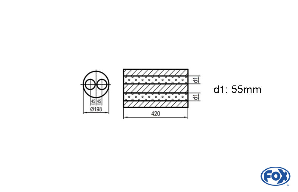 FOX Uni-Schalldämpfer rund zweiflutig - Abwicklung 626 Ø 198mm, zweiflutig, d1Ø 55mm, Länge: 420mm -Ø 198mm