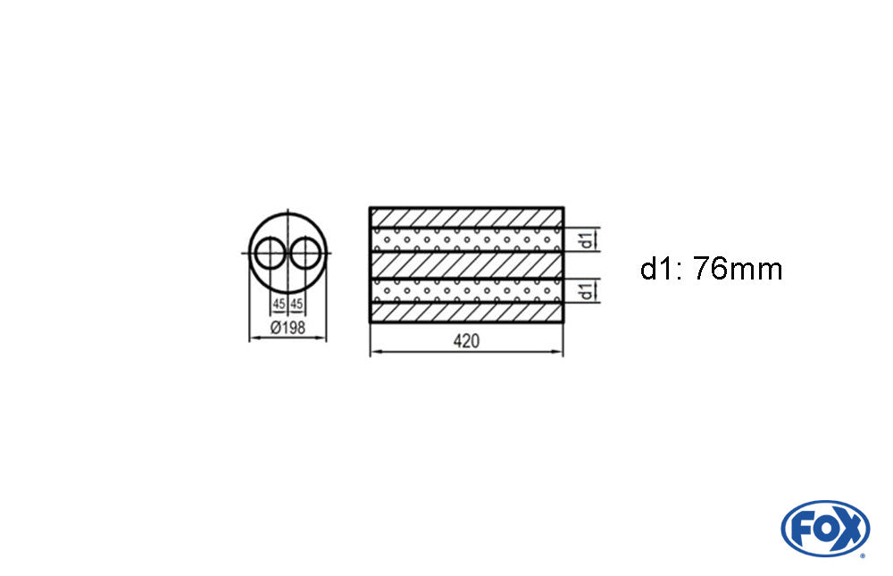 FOX Uni-Schalldämpfer rund zweiflutig - Abwicklung 626 Ø 198mm, zweiflutig, d1Ø 76mm, Länge: 420mm -Ø 198mm