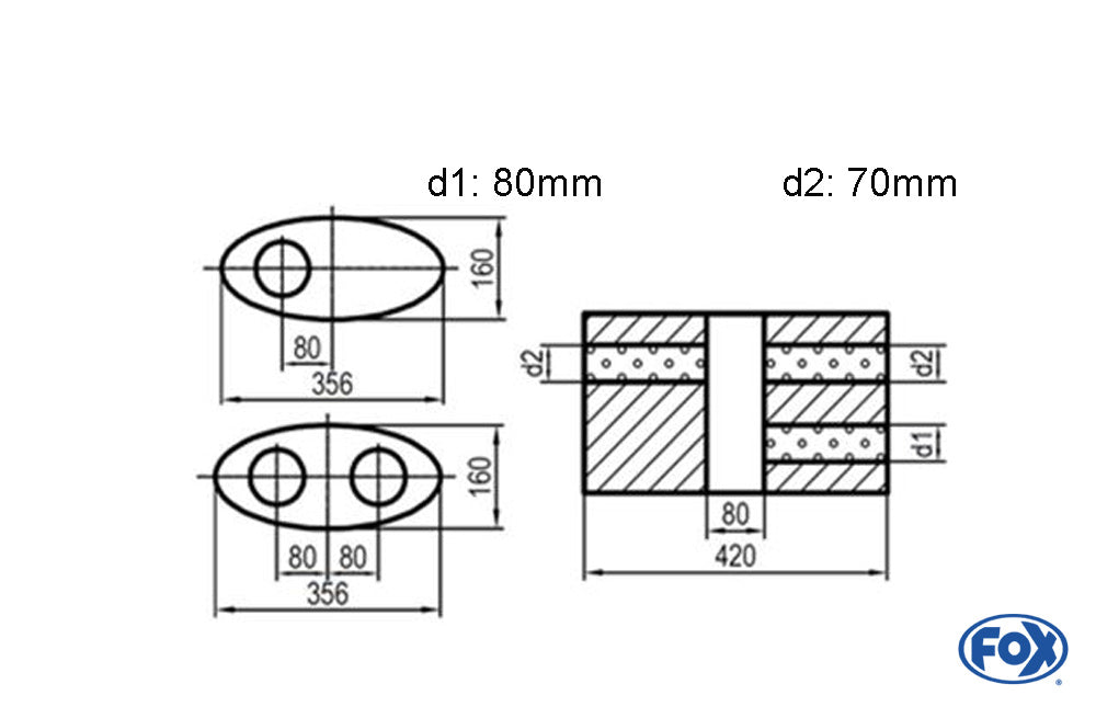 FOX Uni-Schalldämpfer oval zweiflutig mit Kammer - Abw. 818 356x160mm, d1Ø 80mm d2Ø 70mm, Länge: 420mm - Variante 1
