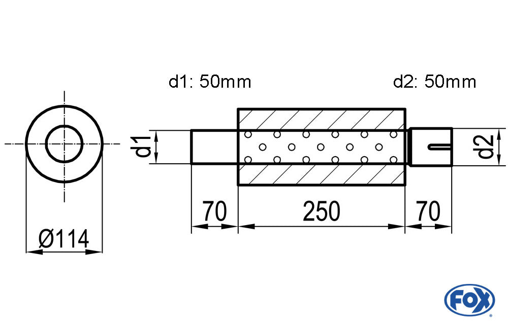 FOX Uni-Schalldämpfer rund mit Stutzen - Abwicklung 355 Ø 114mm, d1Ø 50mm d2Ø 50,5mm, Länge: 250mm