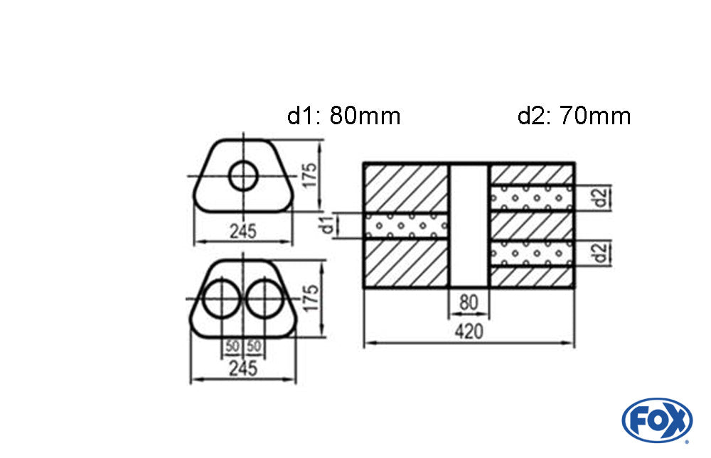 FOX Uni-Schalldämpfer Trapezoid zweiflutig mit Kammer - Abw. 711 245x175mm, d1Ø 80mm d2Ø 70mm, Länge: 420mm - Variante 2