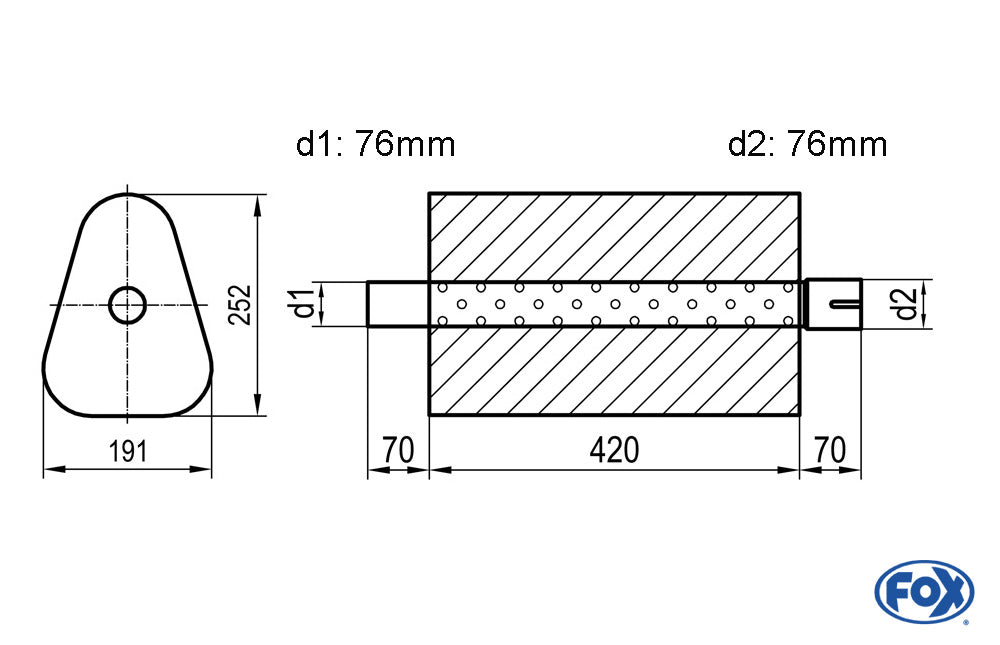 FOX Uni-Schalldämpfer Dreieckig mit Stutzen - Abwicklung 725 191x252mm, d1Ø 76mm außen/ d2Ø 76mm innen - Länge: 420mm