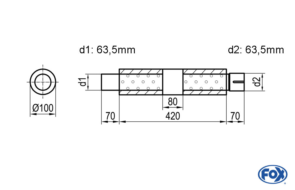 FOX Uni-Schalldämpfer rund mit Kammer + Stutzen - Abw. 314 Ø 100mm, d1Ø 63,5mm (außen), d2Ø 63,5mm (innen), Länge: 420mm