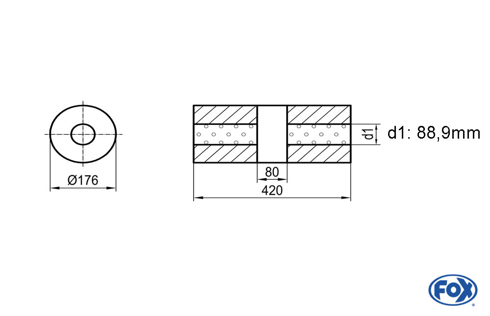 FOX Uni-Schalldämpfer rund ohne Stutzen mit Kammer - Abw. 556 Ø 176mm, d1Ø88,9mm (außen), Länge: 420mm