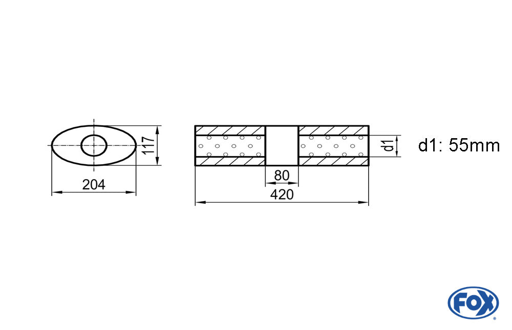 FOX Uni-Schalldämpfer Oval ohne Stutzen mit Kammer - Abw. 525 204x117mm, d1Ø 55mm (außen), Länge: 420mm