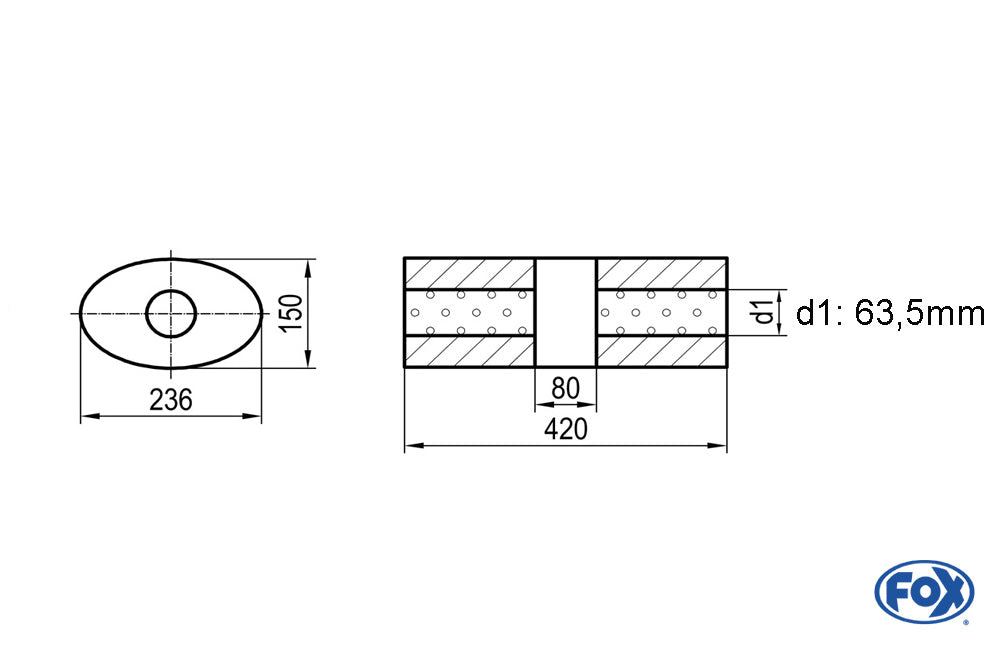 FOX Uni-Schalldämpfer oval ohne Stutzen mit Kammer - Abw. 618 236x150mm, d1Ø 63,5mm, Länge: 420mm