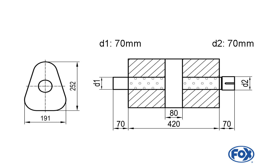 FOX Uni-Schalldämpfer dreieck mit Kammer + Stutzen - Abw. 725 191x252mm, d1Ø 70mm (außen), d2Ø 70mm (innen), Länge: 420mm