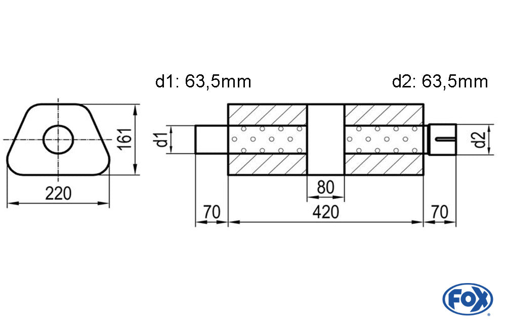 FOX Uni-Schalldämpfer trapez mit Kammer + Stutzen - Abw. 644 220x161mm, d1Ø 63,5mm (außen), d2Ø 63,5mm (innen), Länge: 420mm