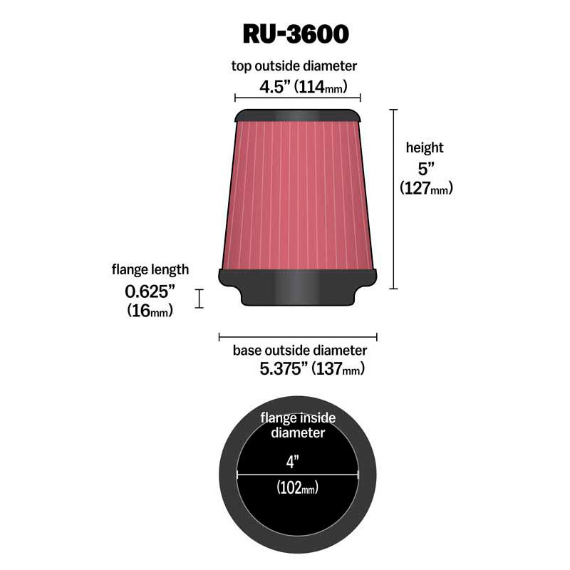 K&N Luftfilter Universal Konisch 102mm Flansch, 137mm Untendurchmesser, 114mm Obendurchmesser, 127 mm (RU-3600)