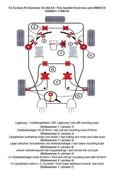 TA Technix PU-Buchsen Kit 37-teilig / Vorderachse+Hinterachse / Vorderachse mit Ø 19mm Stabi / M3 Exzenter / Hinterachse mit Ø 18mm Stabi / passend für BMW 3er Serie E30