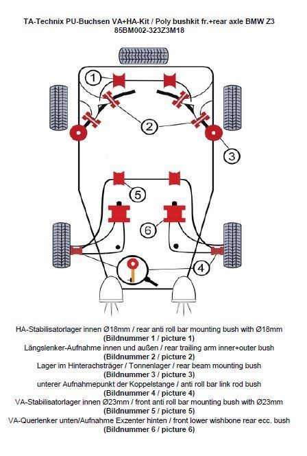 TA Technix PU-Buchsen Kit 32-teilig / Vorderachse+Hinterachse / Vorderachse mit Ø 23mm Stabi / M3 Exzenter / Hinterachse mit Ø 18mm Stabi / passend für BMW Z3 Roadster/Coupe Serie E36