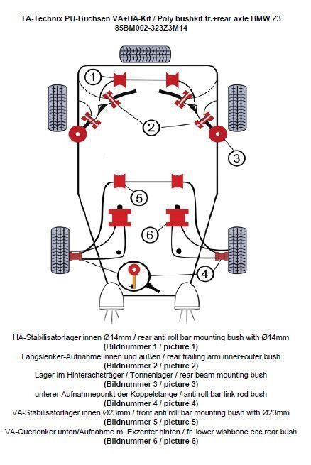 TA Technix PU-Buchsen Kit 32-teilig / Vorderachse+Hinterachse / Vorderachse mit Ø 23mm Stabi / M3 Exzenter / Hinterachse mit Ø 14mm Stabi / passend für BMW Z3 Roadster/Coupe Serie E36