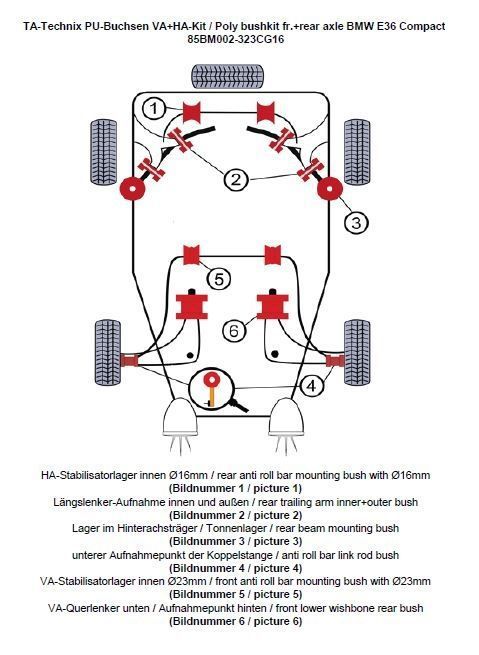 TA Technix PU-Buchsen Kit 32-teilig / Vorderachse+Hinterachse / Vorderachse mit Ø 23mm Stabi / Hinterachse mit Ø 16mm Stabi / passend für BMW 3er Serie E36 Compact